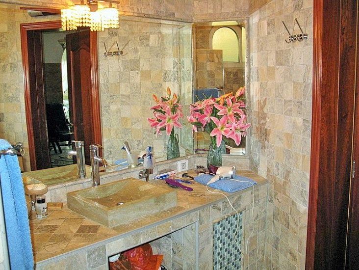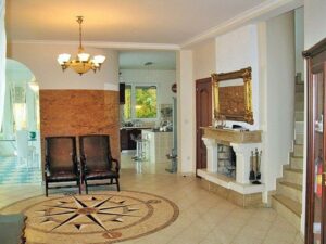 Вилла состоит из двух частей – основного жилого дома и отдельного апартамента для гостей или персонала с собственным входом, кухней и террасой. На первом этаже расположен просторный зал с мраморным камином, современная кухня и обеденная зона, панорамные окна с видом на море и уютный бассейн с подсветкой.