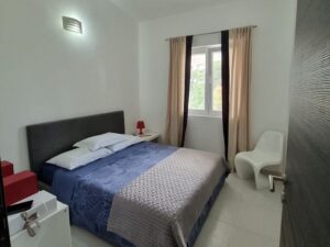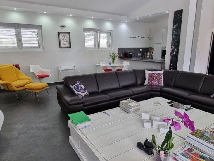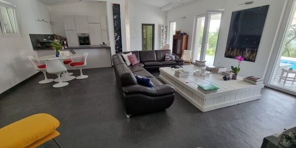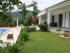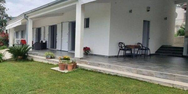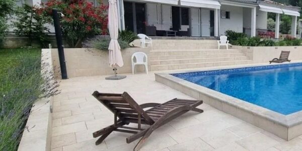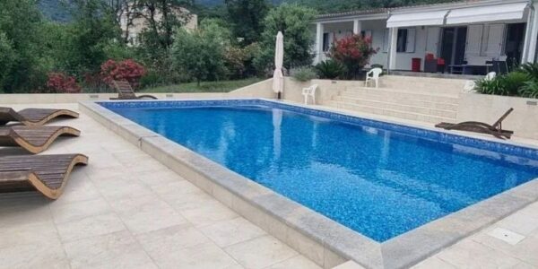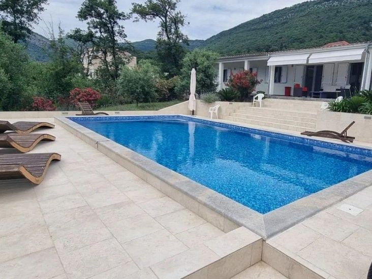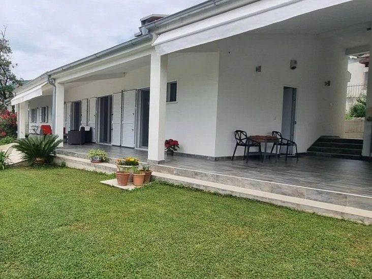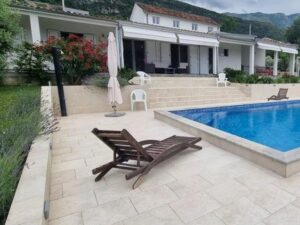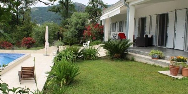 Небольшой дом площадью 239 м² расположен на просторном участке с бассейном в окружении красивого сада, в том числе оливковых и персиковых деревьев. Дом состоит из одного этажа с 5 комнатами, включая четыре спальни и шикарную гостиную с современным интерьером и открытой планировкой, объединяя полностью оборудованную кухню и обеденную зону. Также есть две ванные комнаты, санузел, кладовая и терраса с летней кухней, открывающая замечательный вид на горы и залив. Кроме того, на участке находится отдельный гостевой дом площадью 53 м² и имеются парковочные места на 3-4 автомобиля. К участку проведены городская вода и канализация, есть дополнительная цистерна. От дома до городов Котора и Тивата всего 10 минут езды.