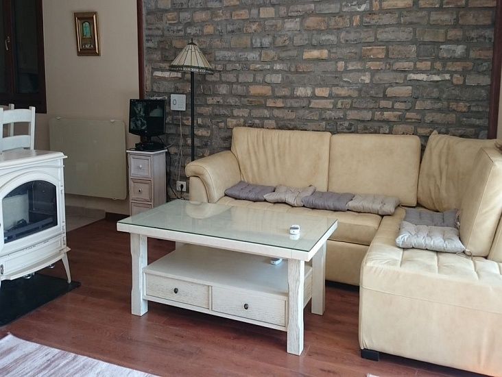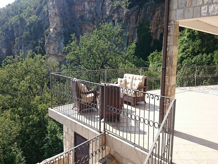 На втором этаже размещена большая спальня с санузлом, ванна-джакузи, гардеробная комната и выход на большую террасу с великолепным видом на красивую природу и море. Дом обогревается камином и кондиционерами.