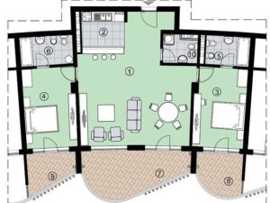 Новая квартира в жилом комплексе с бассейном. Площадь 117 м2. Квартира состоит из 2 спален, большой гостиной, двух ванных и одного гостевого санузла. Шикарный вид на море.