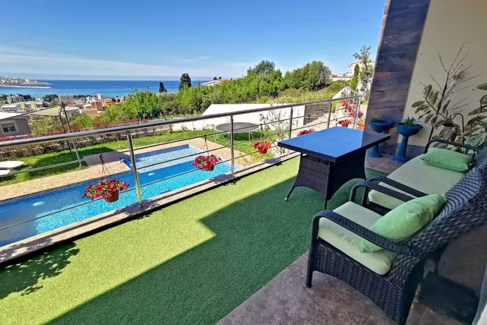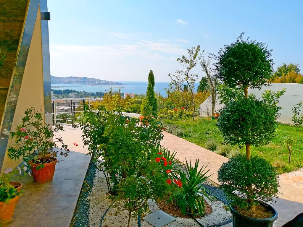 Люкс вилла в Баре – это современный дом с бассейном, большим садом и панорамными видами на море и горы. Вилла расположена в пешей доступности от пляжей и всей городской инфраструктуры города Бар. Такое расположение делает объект удобным для постоянного проживания и комфортного отдыха. Площадь дома составляет 207 м2. Площадь участка – 600 м2, с возможностью расширения. Дом имеет два уровня и панорамную террасу на крыше. Планировка включает четыре спальни, три ванные комнаты, три террасы и несколько подсобных помещений. Панорамное остекление, высокие потолки и просторные комнаты создают ощущение света и свободы. Вилла оснащена современными системами отопления, охлаждения и вентиляции. На территории расположены плавательный бассейн с турбоджетом и джакузи. Система «умный дом» позволяет управлять освещением, роллетами, техникой и видеонаблюдением удалённо. Участок озеленён и обслуживается управляющей компанией. В сервис входят уход за садом, обслуживание бассейна и уборка территории. До моря около 700 метров. До школы 500 метров. До магазина 300 метров. Центр города находится в 2 км.