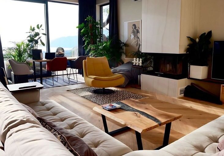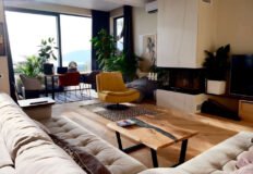 Дом с видом на море Тиват – это современный трехэтажный дом в стиле модерн, созданный для комфортного проживания и отдыха. Дом расположен в жилом комплексе с панорамным видом на Тиватский залив, недалеко от города Тиват. Комплекс занимает участок площадью 23 000 м2 и включает 30 домов, каждый из которых ориентирован на море. Общая площадь дома составляет 220 м2. Площадь земельного участка – 1000 м2. Планировка включает подвал, гостиную с кухней и обеденной зоной, четыре спальни и три ванные комнаты. В доме предусмотрены две террасы и парковочное место. Панорамные окна наполняют пространство светом и открывают красивый вид. Открытая галерея между этажами со стеклянной перегородкой подчёркивает современный стиль дома.