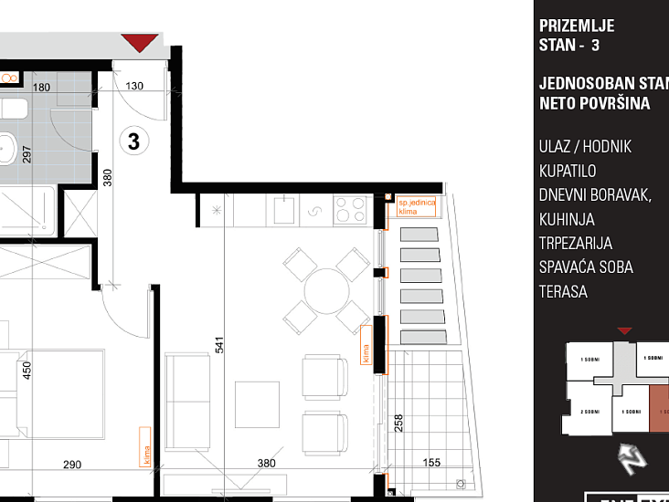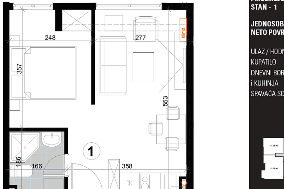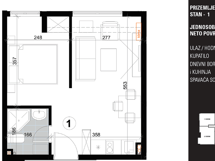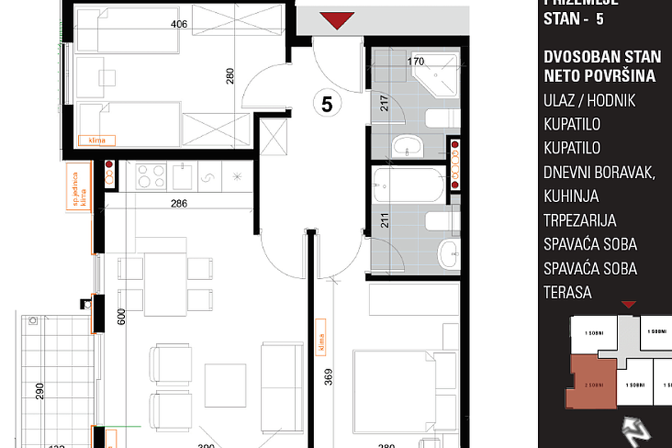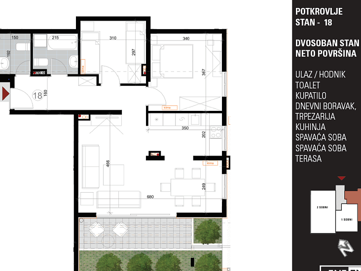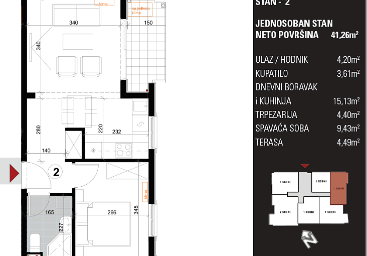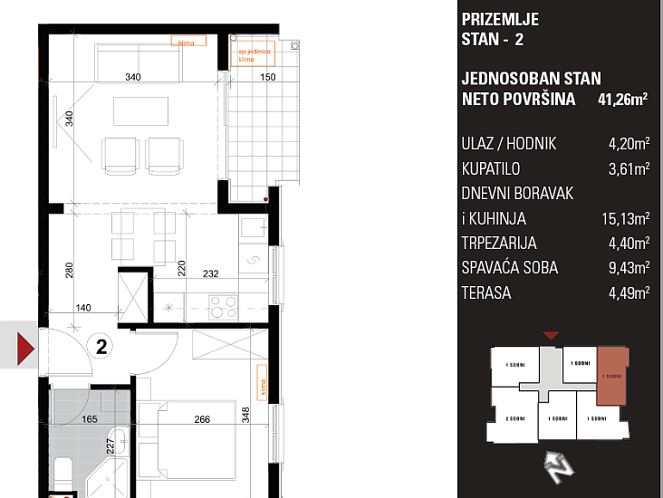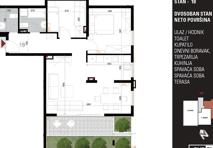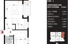 К продаже предлагаются 20 квартир с одной и двумя спальнями: от 28,66 до 76,16 м2. Квартиры имеют вид на Адриатическое море.