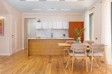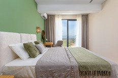 Первый этаж: просторная гостиная открытой планировки. Она объединена с современной кухней и столовой зоной. Из гостиной есть прямой выход на террасу с видом на море. Камин создаёт дополнительный уют и комфорт в прохладное время года. Также на этаже предусмотрены хозяйственные зоны и отдельная кладовая.