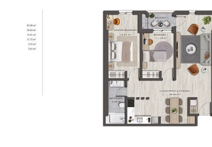 – квартиры с одной спальней от 45 м2 до 64 м2,