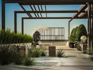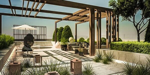Комплекс состоит из 5 корпусов, имеющих сейсмоустойчивую монолитно каркасную структуру с заполнением кирпичной кладкой. Наружные несущие стены толщиной 300 мм облицованы 7 500 м2 веронского травертина на фасаде. Под травертином установлена 4-х уровневая система гидро и термоизоляции, созданная по технологии «теплая керамика», которая также защищает от шума.